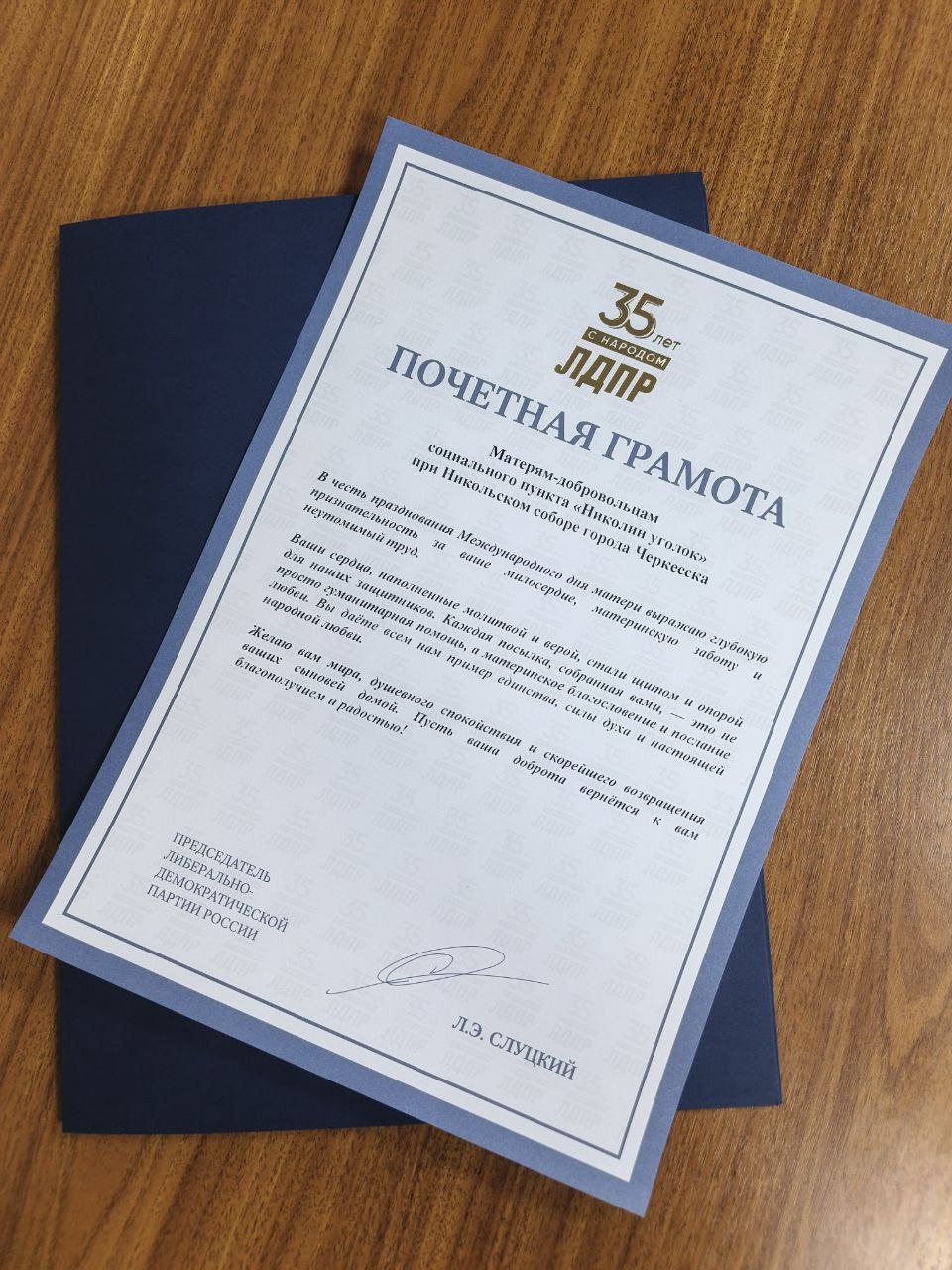В завершение церемонии организаторы мероприятия передали благодарственное письмо от руководителя ЛДПР Леонида Слуцкого волонтёрскому центру «Николин Уголок», высоко оценив их инициативу и благородную миссию.